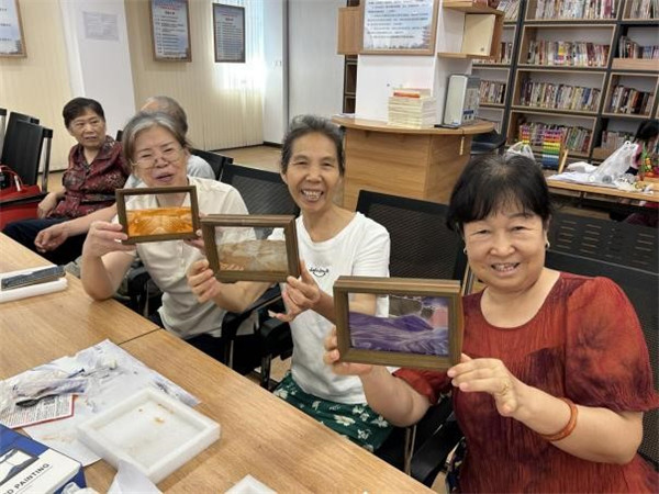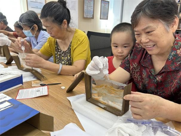 知識分享后,創(chuàng)意十足的流沙畫相框手工環(huán)節(jié)登場。兩種飽含美好寓意的顏色流沙畫 —— 橘色 “背靠金山”、紫色 “紫氣東來”,成為居民們創(chuàng)作的主角。大家圍坐在一起,小心將細膩流沙注入古樸木框,看著流沙緩緩傾瀉、堆積,或勾勒出層巒疊嶂的山水輪廓,或暈染出夢幻的色彩層次,原本普通的流沙,在巧手下變成獨特的藝術(shù)作品。創(chuàng)作過程中,居民們相互交流技巧、分享創(chuàng)意,歡笑聲與討論聲交織,讓社區(qū)活動室滿是溫馨。